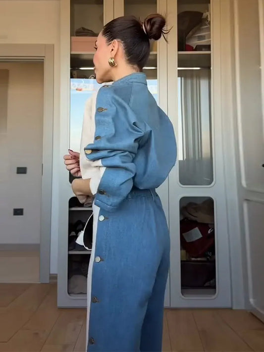 Womens Denim Jacket Pants Set Lapel Button High Waist Straight Trousers