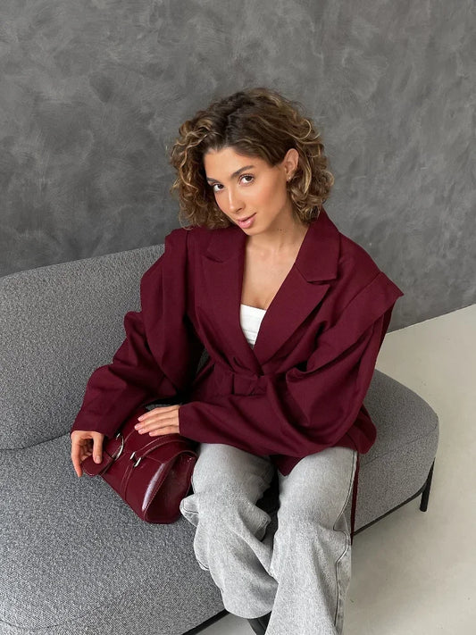 Womens Casual Dark Red Leather Look Jacket Loose Lapel Long Sleeve Button