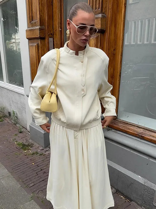 Womens White Stand Neck Jacket Pants Set Loose Wide Leg Single Breasted