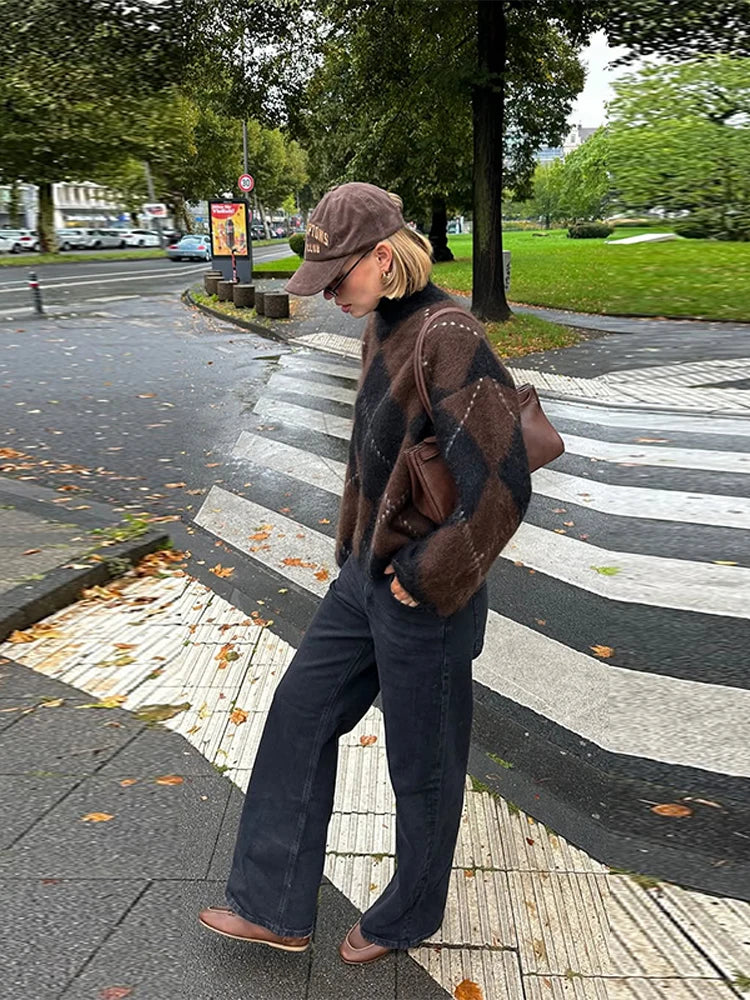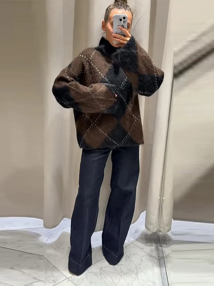 Womens Loose Casual Turtleneck Sweater Argyle Pattern Drop Shoulder Pullover