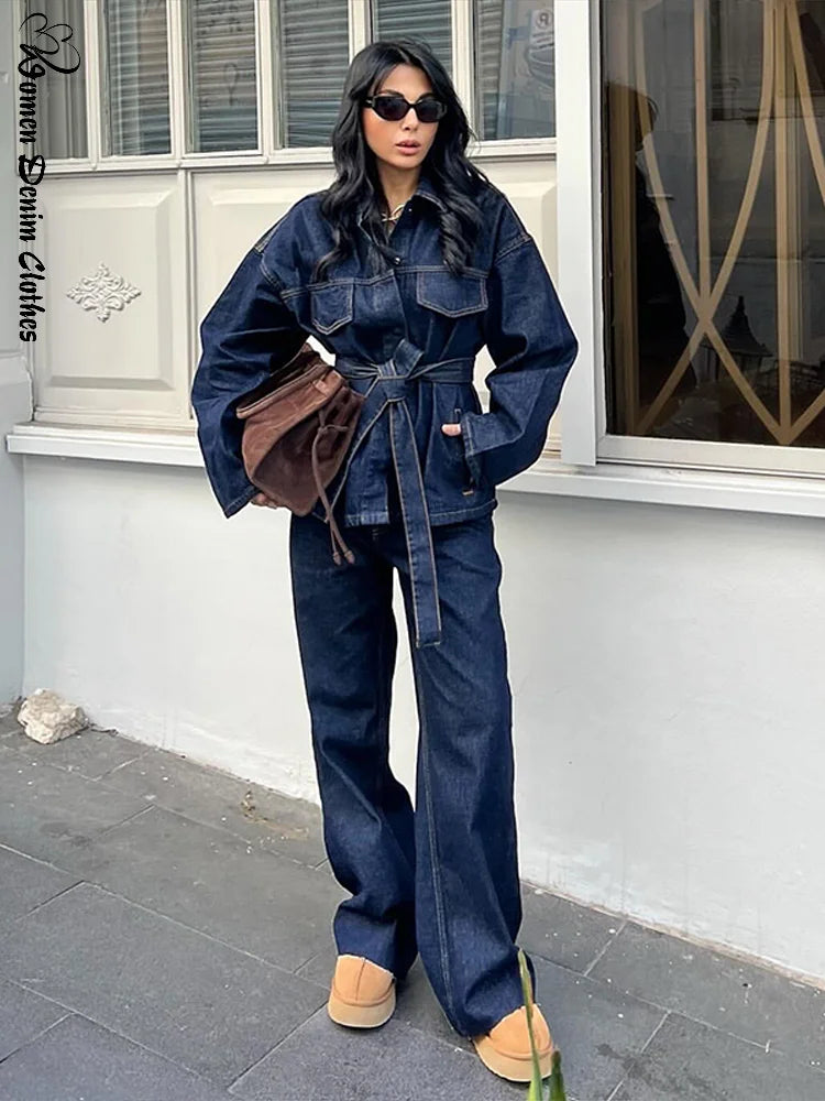 Womens Denim Jacket Pants Set Lapel Button High Waist Straight Trousers