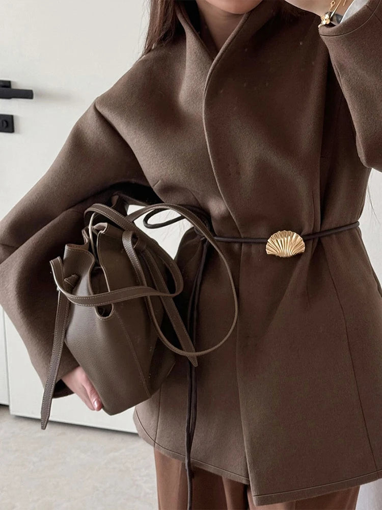 Brown Lace Up Long Sleeve Jacket Womens Stand Collar Slim Fit Street Wear