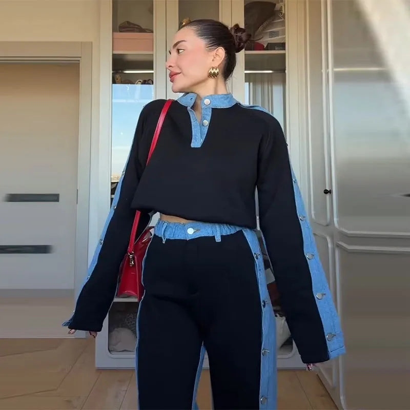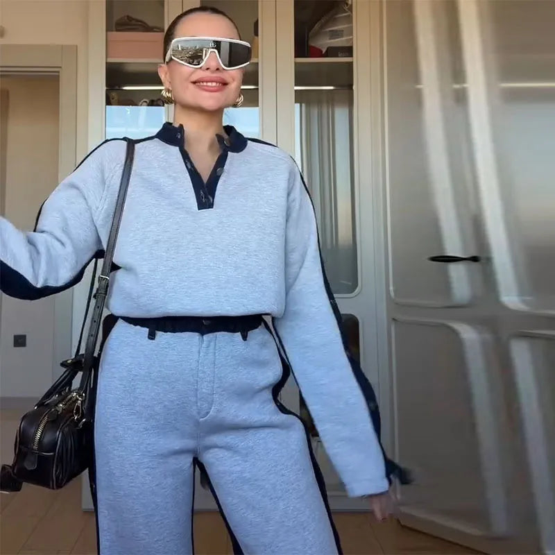 Womens Spring Sport Set Long Sleeve V Neck Tops High Waist Wide Leg Pants
